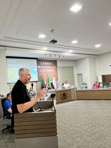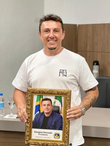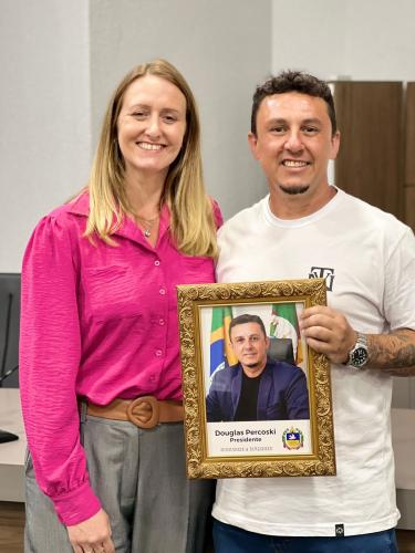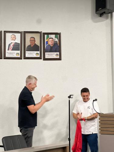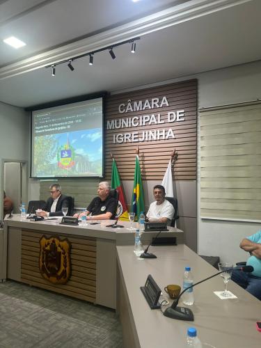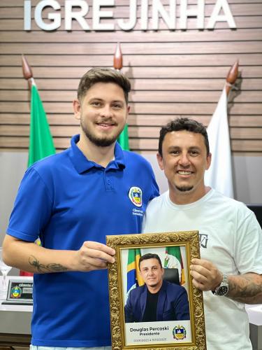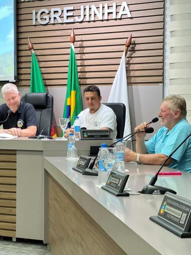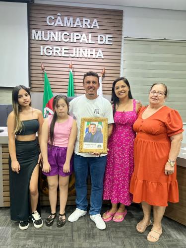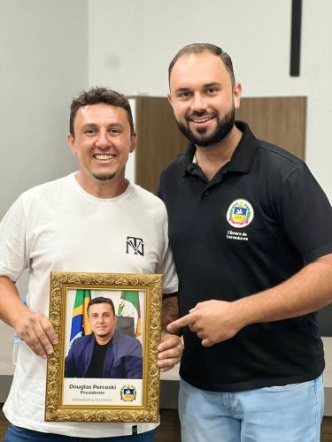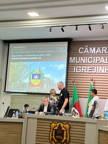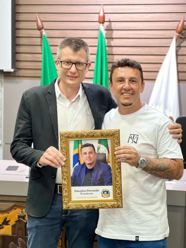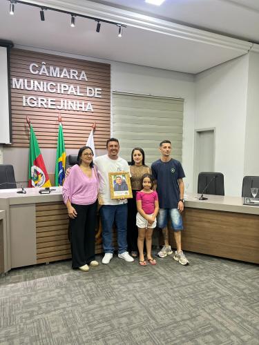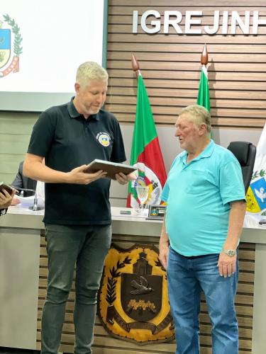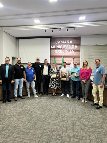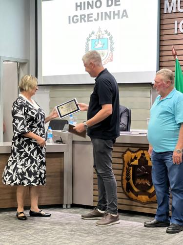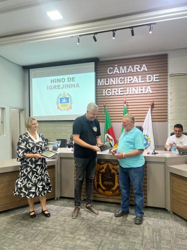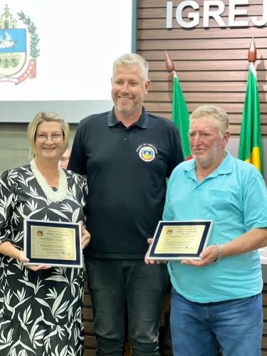 Homenagem especial ao vereador Douglas Rodrigues Percoski, por ter presidido a Câmara de Vereadores de Igrejinha no ano de 2023 e aos Servidores Públicos Pedro Celito Berwanger e Cristiana Elizabeti Sohne.