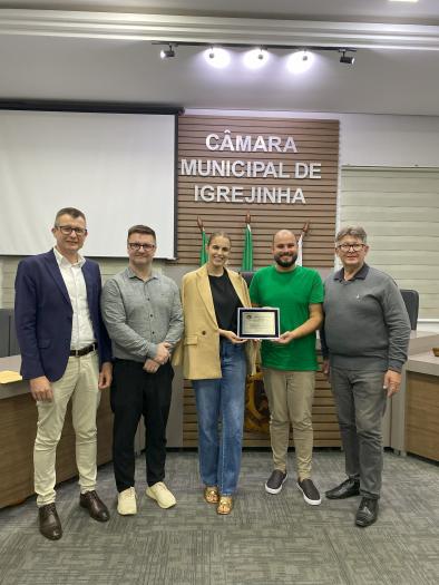 Em Sessão Solene realizada na noite desta terça-feira (08), a Câmara de Vereadores de Igrejinha prestou homenagem à empresa Calçados Tabita pelos seus 55 anos de história. A proposição foi feita pelo vereador Neimar Parreira (PP), reconhecendo a expressiva trajetória da empresa e sua importância para o desenvolvimento do município. A cerimônia contou com a presença do prefeito de Igrejinha, Leandro Höerle; do vice-prefeito, Juliano Müller de Oliveira; de secretários municipais; e de pessoas ligadas à empresa homenageada.