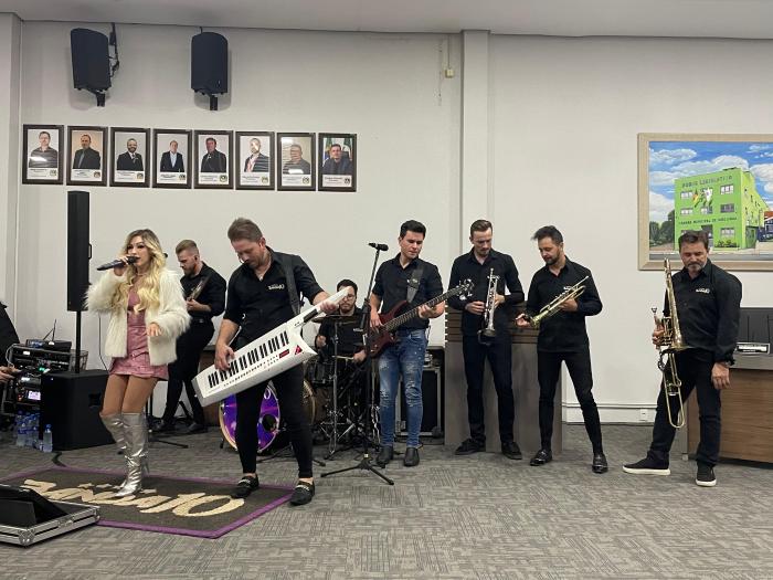 Na noite desta segunda-feira (25), o plenário da Câmara de Vereadores de Igrejinha se transformou em um palco de talento e celebração. Isso porque foi realizada uma Sessão Solene em homenagem à Banda 10 pelos seus 25 anos de trajetória. A cerimônia teve início e encerramento com um verdadeiro show, celebrando a música produzida em Igrejinha por uma das mais importantes bandas de baile da atualidade.